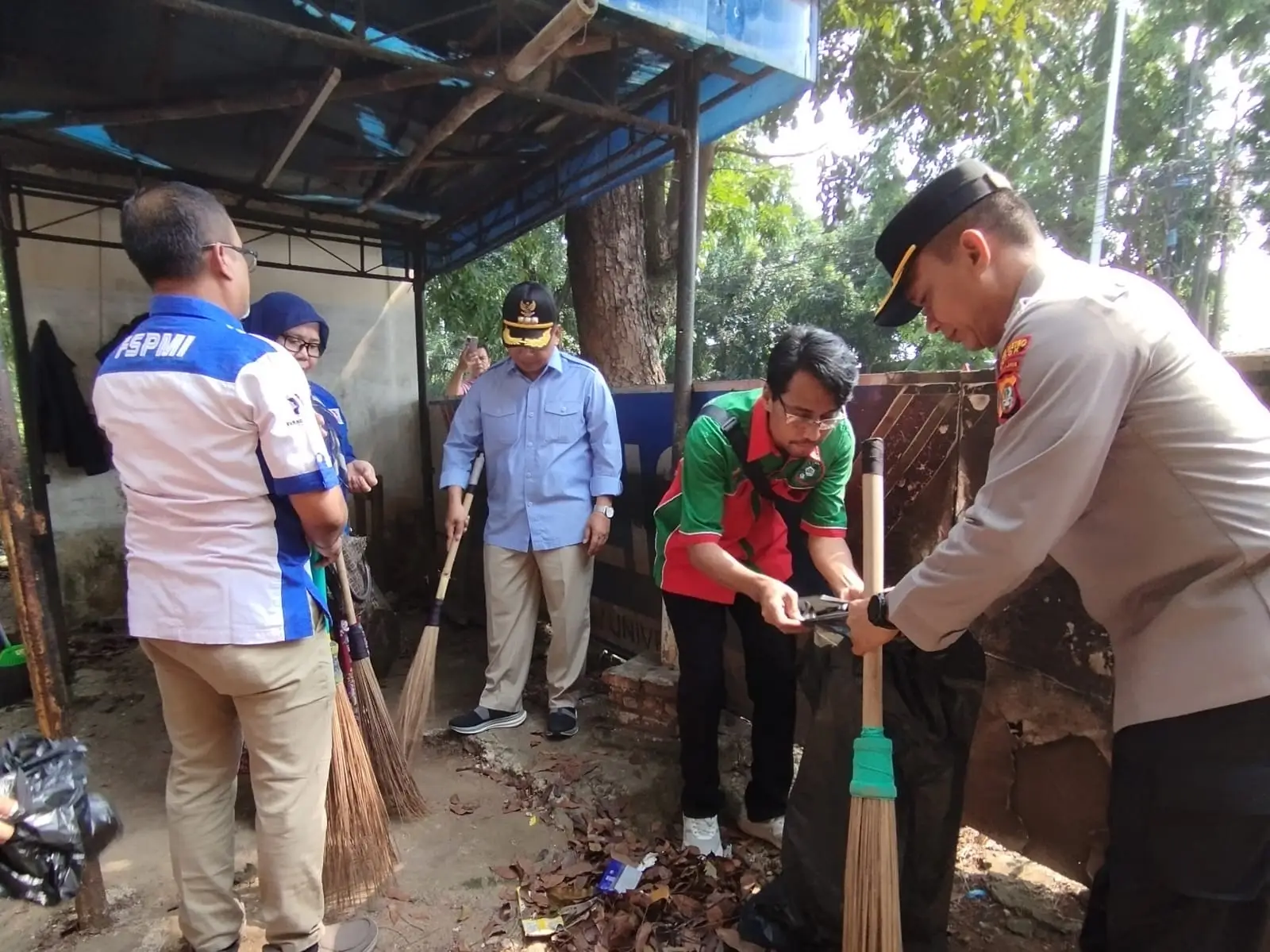 Wali Kota Depok Supian Suri bersama Kapolres Metro Depok Kombes Pol Abdul Waras dan FBD melakukan aksi bersih-bersih di Pos Polisi Jalan Akses UI, Jumat (05/09/25). (Foto: Diskominfo)